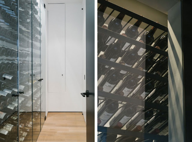 The subtle wood grain of the hallway turns the corner to continue on the upper kitchen cabinets. A glass panel above the sink reveals the adjacent wine cellar.”